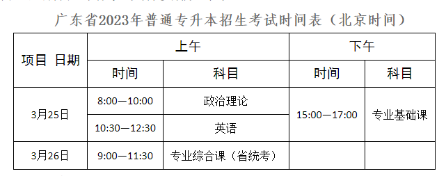 广东省2023年普通专升本招生考试时间表(北京时间)